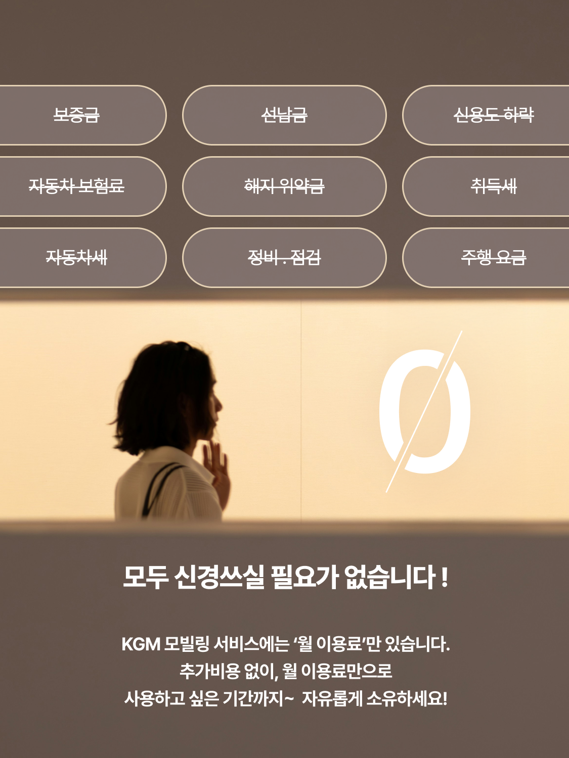 | 3개월 이후, 언제든 자유로운 이용해지 위약금 Zero | 계약부터 이용반납까지 보증금・선수금 Zero |