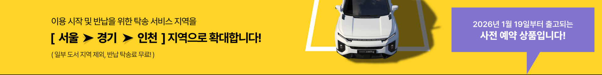 | 차량의 배송 지역 및 이용 후 반납 탁송은 ‘서울・경기・인천’ 지역으로 한정됩니다 상품 구매 시, 차량 인수 장소와 이용시작 희망일을 지정해주셔야 합니다 월 구독 해지 시, 알림 문자 수신 후, 차량 회수를 위한 장소와 시간에 대해 회신해 주시면 됩니다 이용시작과 반납 시 필요한 배.반송 주소지만 서울・경기・인천 지역 (일부 도서 지역 제외)으로 제한되며, 이용 시작 후 주행지역에 제한은 없습니다 |