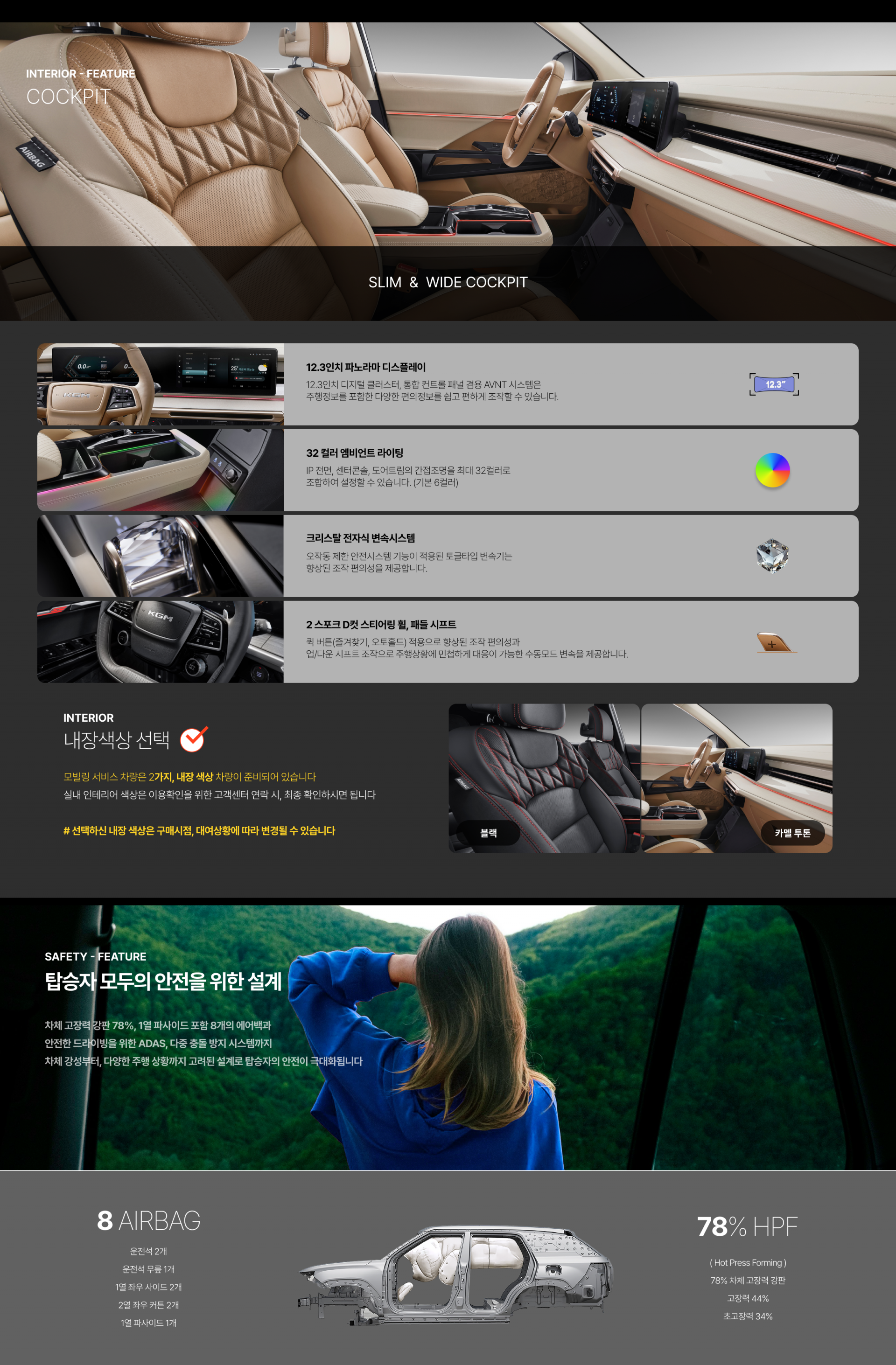 | 4등식 프로젝션 LED 램프와 건곤감리, 수평 주행등으로 주.야간 시야확보 용이 | 대형 글라스가 적용되어 시원한 개방감을 선사하며, 실내 채광 효과 제공 및 환기 용이 | 고프로, 차량 보호장비, 타프 장착 등 아웃도어 액티비티에 다양하게 활용 | 역동적 인피니티 사선 패턴의 20인치 다이아몬드 컷팅 휠과 4계절 타이어로 안전한 주행 가능 |